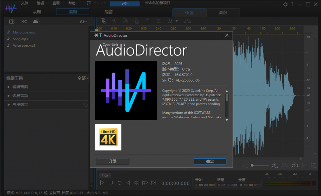 CyberLink AudioDirector Ultra是一款专业的音频编辑解决方案,直观的音频编辑,增强和修复工具如何显着提高视频项目的质量。您可以对您的视频音频进行精准和灵活的编辑和音轨修复等操作,具有一系列专业和高端的工具,是专业视频制作者的必备工具,软件的功能强大且丰富,但是使用上来说并不会很困难,简体中文界面将不用考虑语言的问题,并且也非常容易上手,您可以通过简单的操作导入您的音频文件以及视频音频轨道中的数字音频,不管是录制、剪辑、剪切、恢复和增强操作都很方便,如果你有需要,你也可以为音频应用效果、将音频保存为不同格式、以及将来自多个源的音频混合成一个文件。